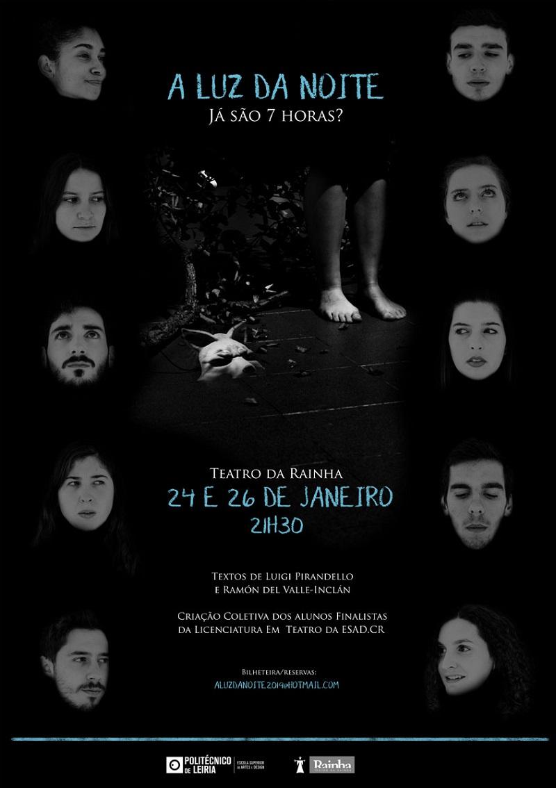 Estudantes finalistas da licenciatura em Teatro da Escola Superior de Artes e Design das Caldas da Rainha (ESAD.CR) do Politécnico de Leiria sobem ao palco do Teatro da Rainha nos dias 24 e 26 de janeiro, para apresentar a peça “A luz da noite – Já são 7 horas?”. Sob a direção de Rita Durão, 11 alunos finalistas apresentam a criação coletiva de uma colagem de textos de Luigi Pirandello e Ramón del Valle-Inclán, num espetáculo que resulta da coprodução da ESAD.CR e do Teatro da Rainha. A entrada está sujeita a reserva de lugares, através do e-mail: Este endereço de email está protegido contra piratas. Necessita ativar o JavaScript para o visualizar.. As sessões têm início às 21h30.