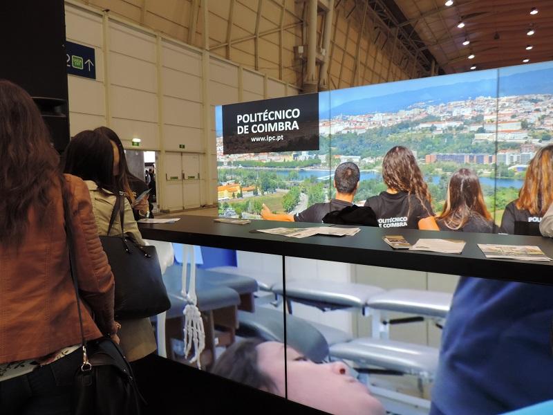 A grande novidade do stand do IPC na Futurália e “diferenciadora” dos restantes expositores desta feira de formação e educação é, avisa-nos o aluno de Mestrado João Cardoso, assenta nos ecrãs touchscreen ali à mão de semear dos visitantes e que, com base na tecnologia do futuro, narram os 40 anos de história daquela instituição de ensino.