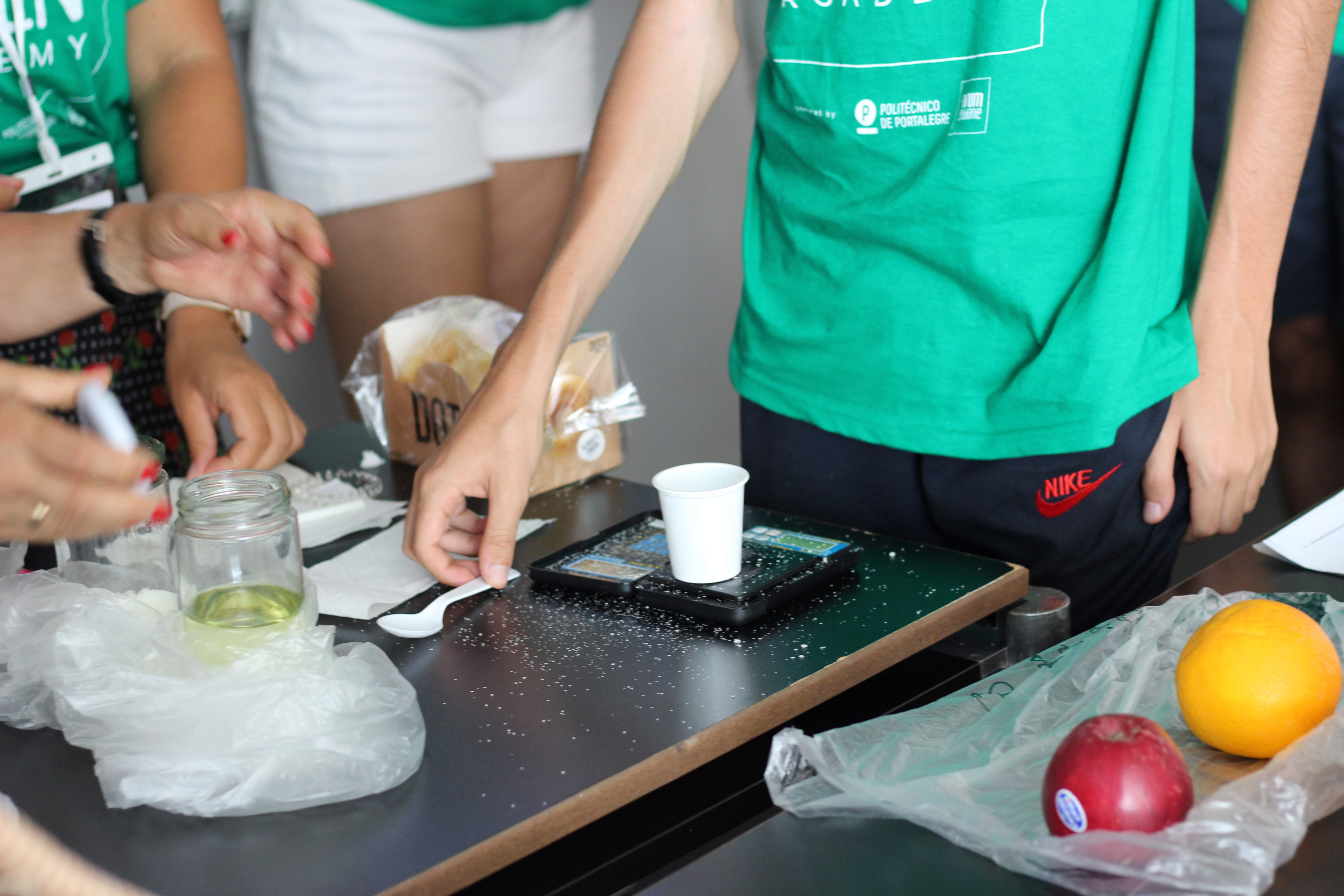 A primeira atividade da parte da tarde foi relacionada com a alimentação, sob a coordenação da professora Margarida Malcata, docente na área da saúde infantil e pediatria. Primeiro, os participantes pesaram alimentos rotulados, não saudáveis, para calcular a quantidade de gordura, açúcar e sal. “Os jovens não tinham noção do quanto estes alimentos não são saudáveis, e ficaram espantados quando perceberam”, revelou a professora. Num alimento saudável, como uma cenoura, “perceberam que o único elemento existente era o açúcar, a dita frutose, e numa quantidade mínima”.