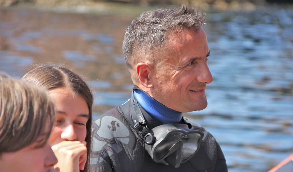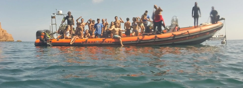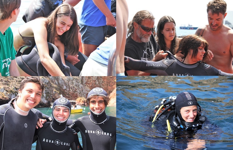 E dentro quer mesmo dizer dentro. Muito dentro. A uma profundidade grande. No batismo de mergulho, concretizou-se uma das atividades que mais tinha vindo a ser falada e ansiada. Já ao redor da Berlenga, com vista para os rochedos que se aclaram pela água cristalina, que flutua entre o azul e o verde, vestem-se os fatos de mergulho, e ouve-se a primeira dica fundamental do dia. “Sabem qual é a regra número um do mergulho? Comunicação permanente e estar em sintonia com o vosso instrutor”, avisa um dos mergulhadores que vai ajudar a criar muitos sorrisos lá em baixo. António Micael fá-lo há quase 20 anos, e é apenas um dos nomes que, seguramente, marcou para sempre a vida destes 20 jovens, que tiveram a ousadia de atirar-se à água, seguir caminho rumo às profundidades repletas de biodiversidade, onde peixes de todas as cores e tamanhos prometem tornar a experiência ainda mais especial.