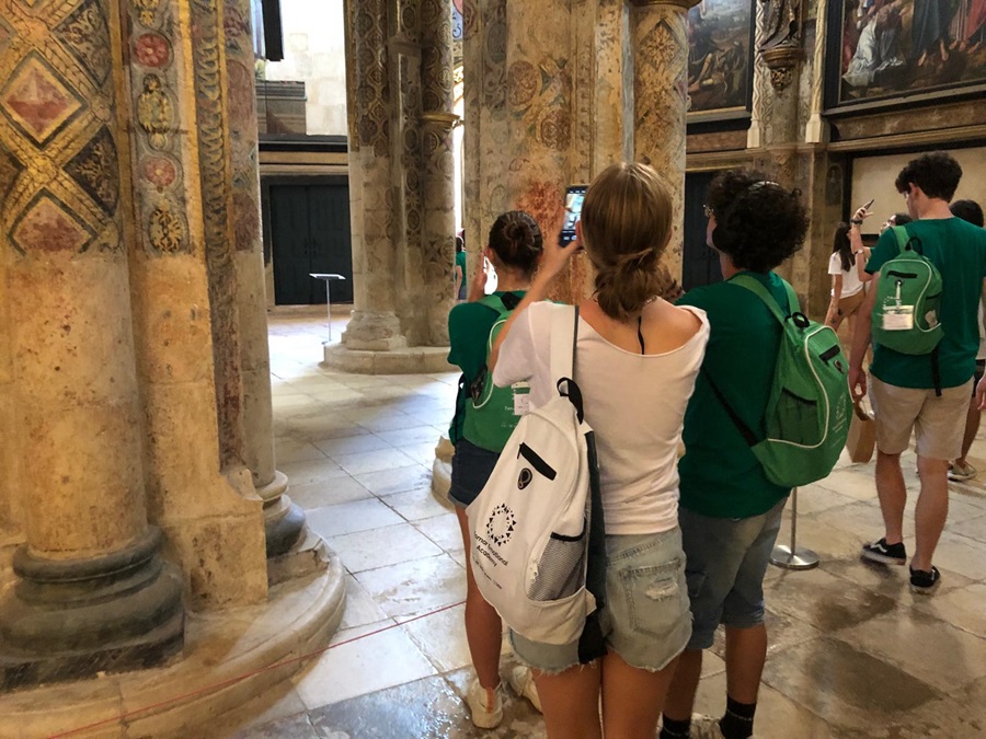 Chegou o autocarro e era altura de ir a um dos pontos altos da estadia por Tomar: o Convento de Cristo. Uma visita guiada levou-nos a conhecer o convento, fundado pela Ordem dos Templários há mais de 800 anos e que durante a sua longa história acolheu diferentes ordens e foi alvo de várias intervenções, sendo uma das suas características mais célebres a Janela Manuelina, ou Janela do Capítulo. Neste momento os nossos participantes tiveram oportunidade de percorrer os claustros, a nave, a cozinha e outras das divisões deste monumento histórico, no qual aproveitaram, claro, para capturar fotos e vídeos com os seus telemóveis para mais tarde lembrar esta visita.